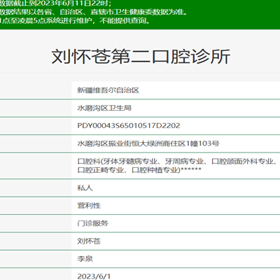 乌鲁木齐刘怀苍第二口腔诊所是怀苍口腔的的分店,经营范围包括:医疗服务;诊所服务;医疗美容服务;健康咨询服务(不含诊疗服务);护理机构服务(不含医疗服务);养生保...