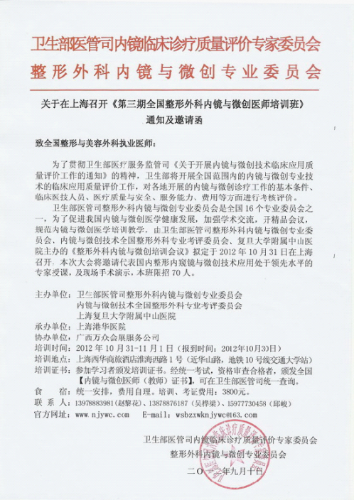 由卫生部医管司整形外科内镜与微创专业委员会、内镜与微创技术全国整形外科专业考评委员会、主办的《整形外科内镜与微创培训会议》拟定于2012年10月31日在上海召开...[详细]