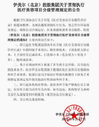 2012年8月23日,医疗美容连锁品牌伊美尔控股集团宣布,在其全集团范围内不再开展四级手术项目:颧骨降低术、下颌角肥大矫正术、上下颌骨其它成形术、巨乳缩小术。伊...[详细]